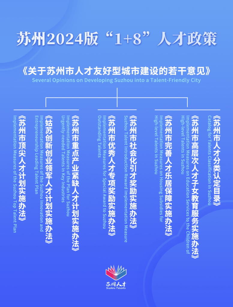 具体来看,“1+8”人才政策体系主要包括:《关于苏州市人才友好型城市建设的若干意见》1个统领性文件,顶尖人才、领军人才和重点产业紧缺人才3项重点人才计划,优秀人才专项奖励、社会化引才奖励2项专项奖励政策,人才乐居保障、高层次人才子女教育服务和人才分类认定目录3项服务保障政策。